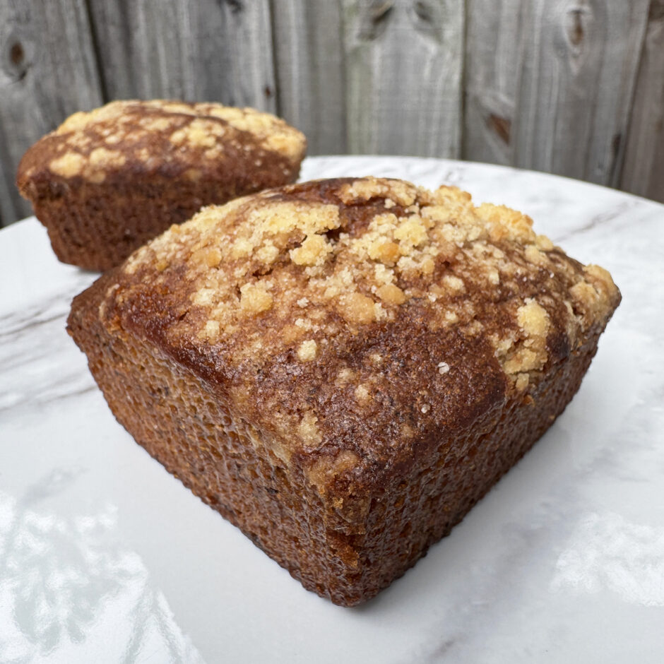 We also bake banana bread in loaves, but sometimes, you just want a little square! Dotted with spiced apple bits and topped with just a streusel, they’re the perfect size for combining with a latte or light lunch. Have you tried spreading on a little peanut butter?