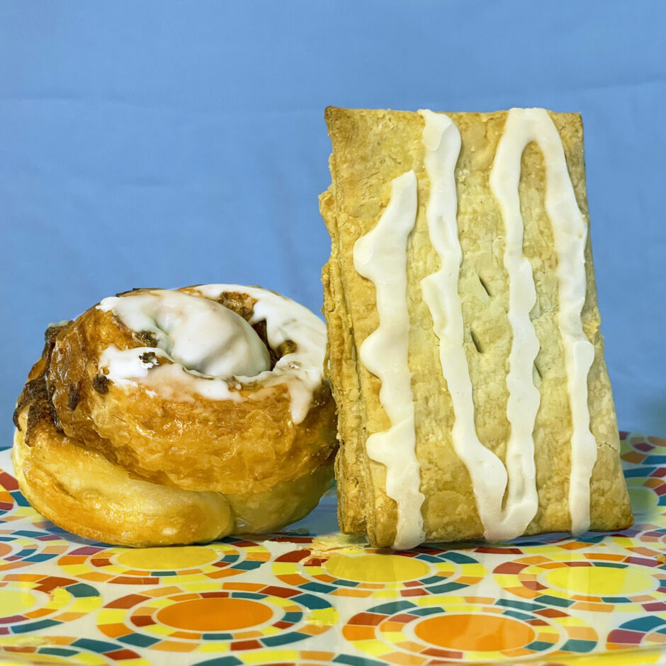 Our version of a delicious toaster pastry, a tart that pops with flavor … if you know what we’re saying! We fill our flaky pie crust with all sorts of goodness. This tart’s packed with our cinnamon roll filling and topped with icing. We also bake tarts in cookies and cream, apple, strawberry, raspberry, and guava.