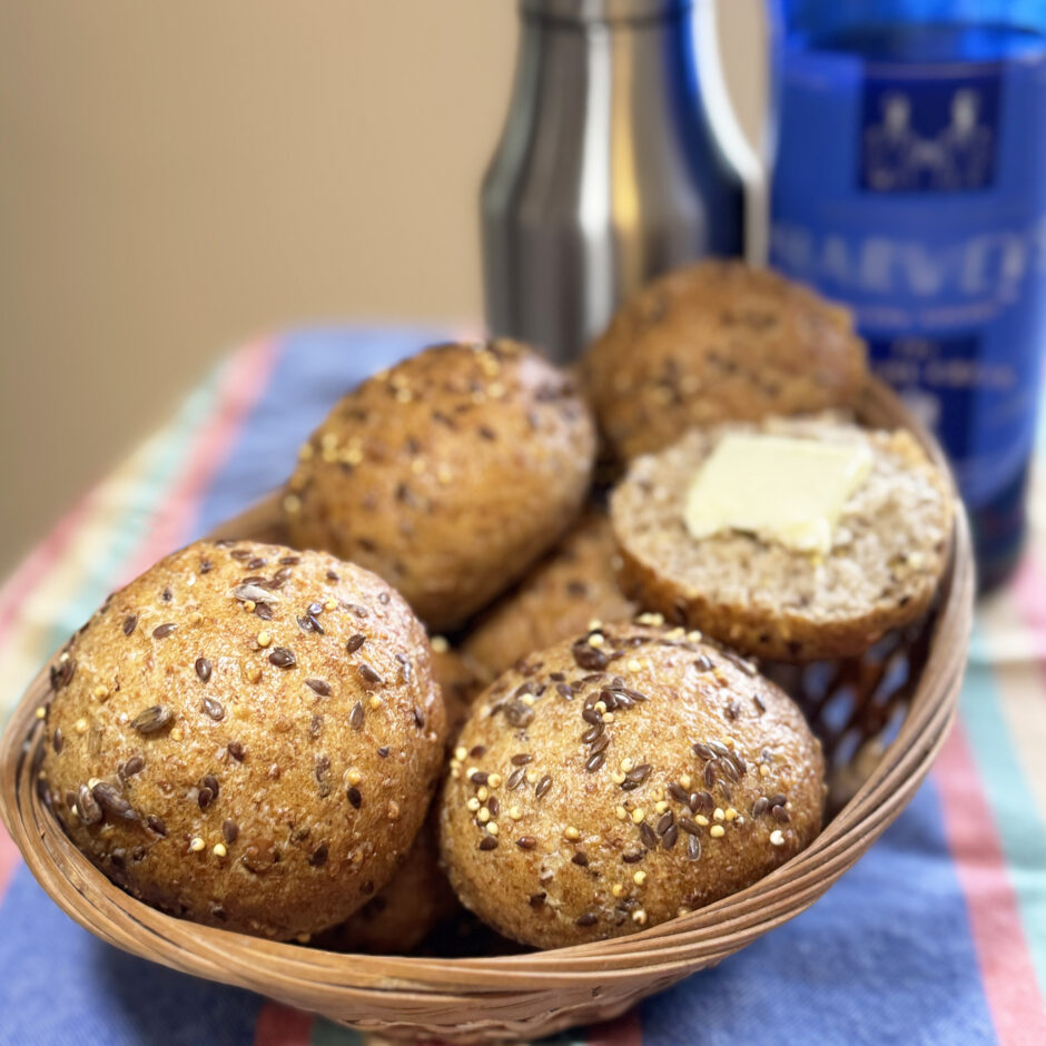 Hearty and healthy can taste good too. Our multigrain dinner rolls are a nine-grain blend rounded out by rye and whole wheat flours, and then topped with flax, sunflower, and millet seeds.